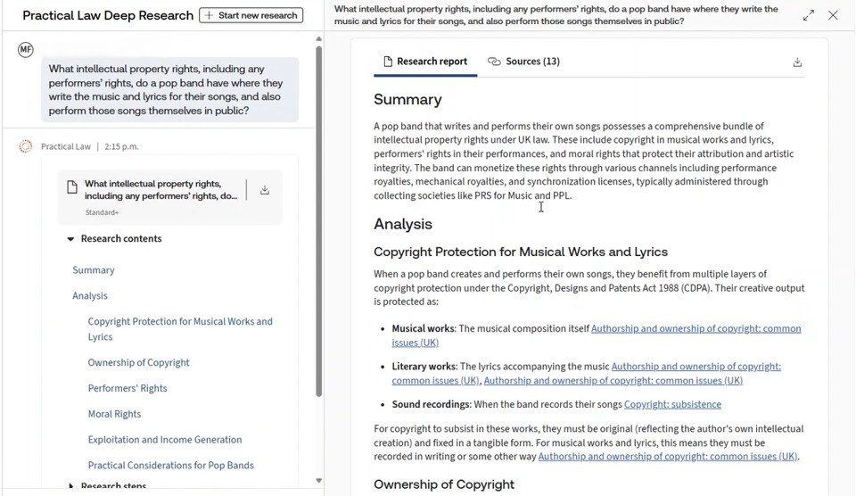 Deep research in CoCounsel is built to reason, plan and deliver legal research grounded in Westlaw and Practical Law content. It enables legal professionals to hand off full research questions to AI, which explains its process, sources its answers, and builds the argument foundations, with human oversight. Additionally, it generates multistep research plans, traces its logic with transparent reasoning and delivers Westlaw and Practical Law citation-backed reports.