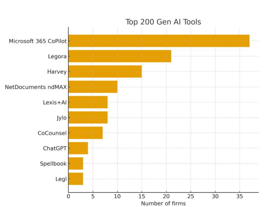 - Microsoft CoPilot in its various flavours shows up in around 37 firms – by some distance the single most common Gen AI label, reflecting its position as an ambient AI layer in Microsoft-centric firms rather than a dedicated “legal AI system”