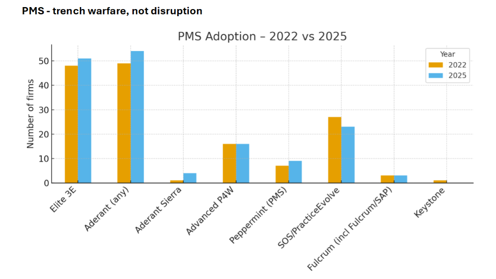 At first glance the PMS chart still looks like a story of incremental change. Among the top 200 firms, Elite 3E rises from 48 to 51 sites between 2022 and 2025, and Aderant from 49 to 54, according to our data as it stands. Advanced P4W, Peppermint and SOS/PracticeEvolve move only a few firms either way. On the numbers alone, you would say the duopoly is intact and the mid-tier is gently reshaping itself.