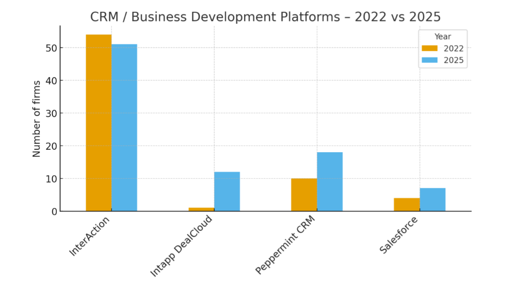 Intapp DealCloud moves from a rounding error in 2022 to double-digit adoption in 2025, and is now a serious option for deal-driven practices. From early research it appears that this trend is even more apparent in the US – as will be apparent when we release the US Top 200 update in the near future.