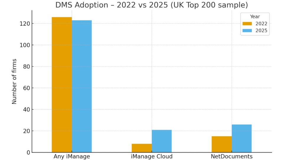 NetDocuments is the one clear challenger, almost doubling its footprint and now into the mid-20s of firms. SharePoint-only DMS and other alternatives barely register as the system of record according to our data, however we know that outside of the UK Top 200 there have been some interesting shifts and this is an area to watch.